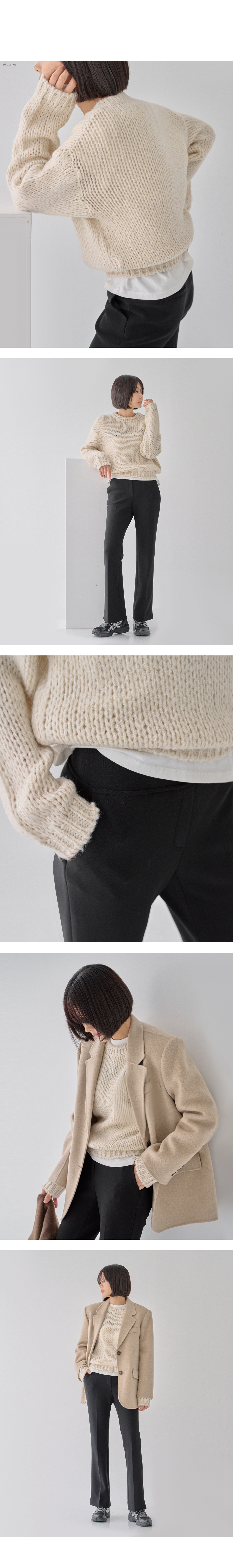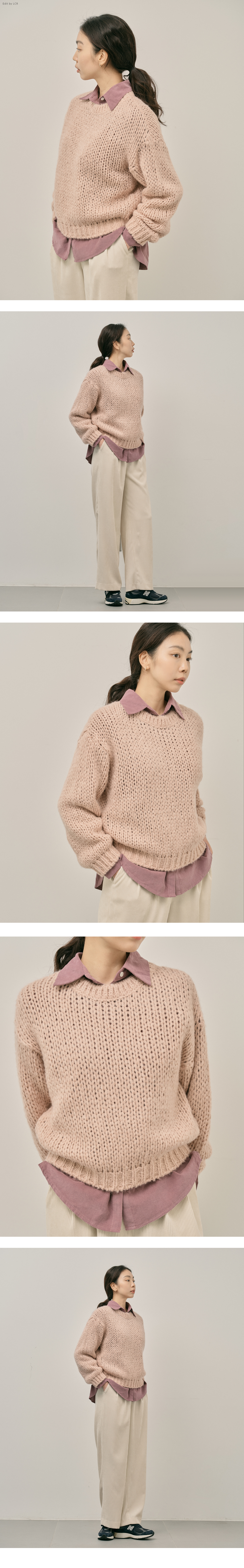 부드러운 텍스처로 완성된 니트로 짜임이 굵고 여유 있는 핏이지만 어깨 라인이 살짝 드롭되어 편안하고 안정적인 핏이 연출됩니다.