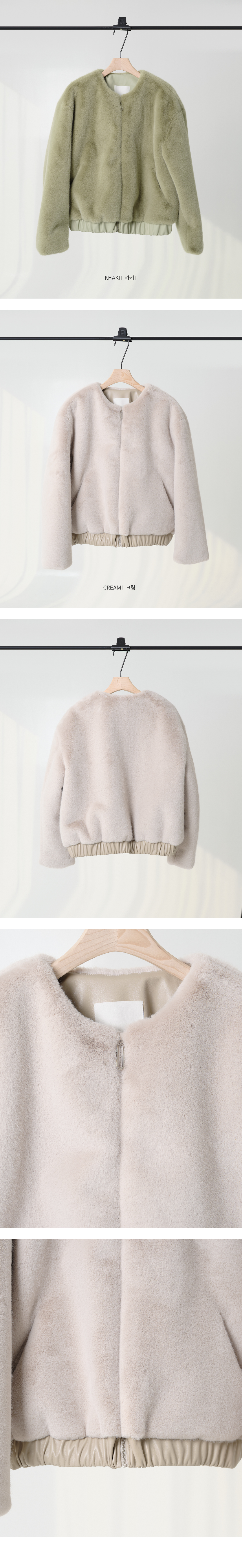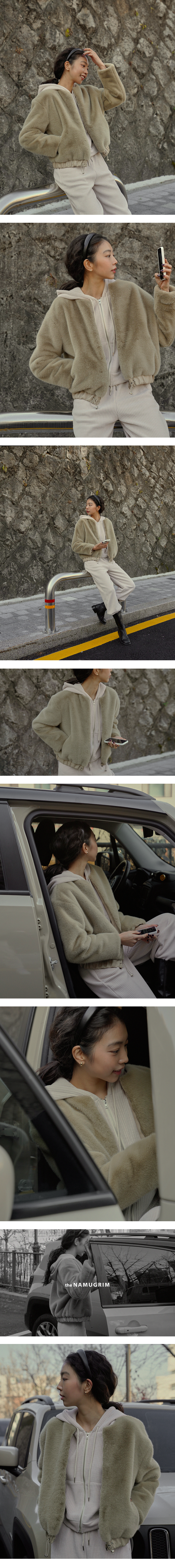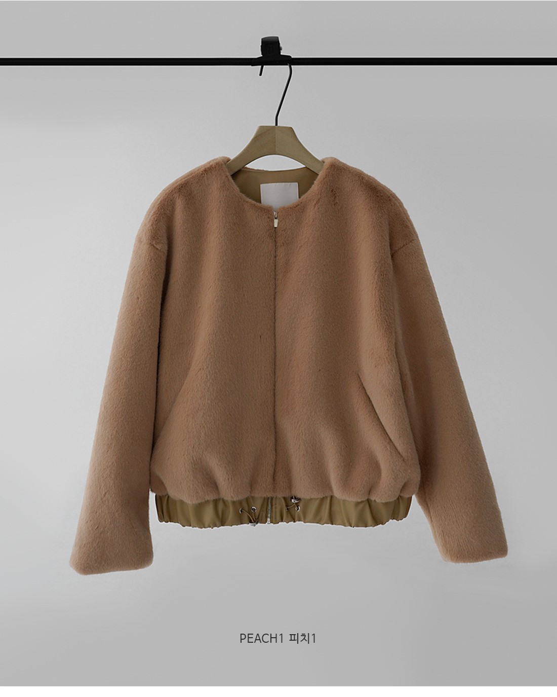 노카라의 라운드 넥과 지퍼로 클로징 디테일, 밑단의 스트링으로