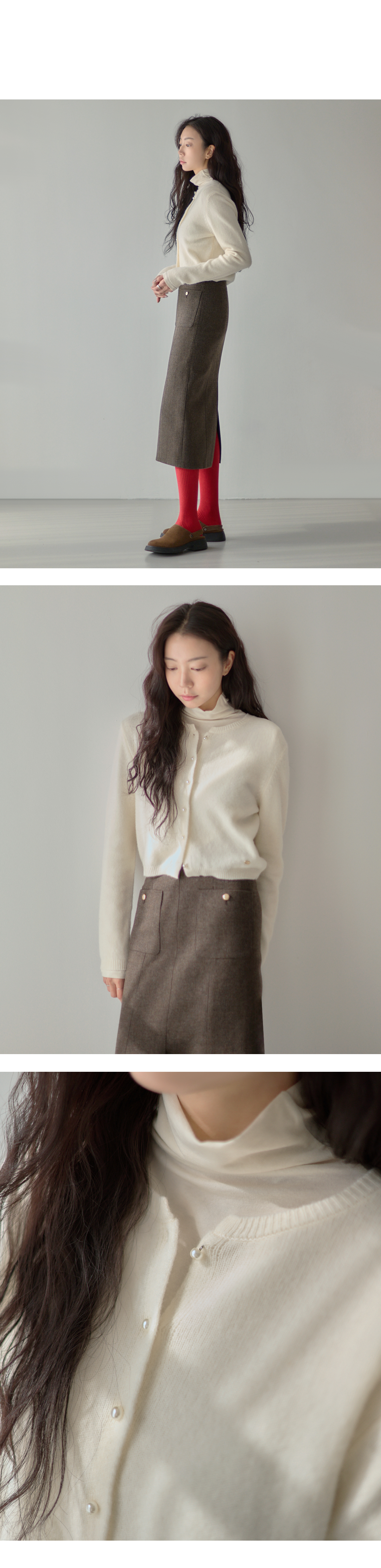 울 100% 소재로 폭닥하고 소프트한 착용감을 선사하며 진주 버튼 여밈으로 여성스러움을 강조했습니다.