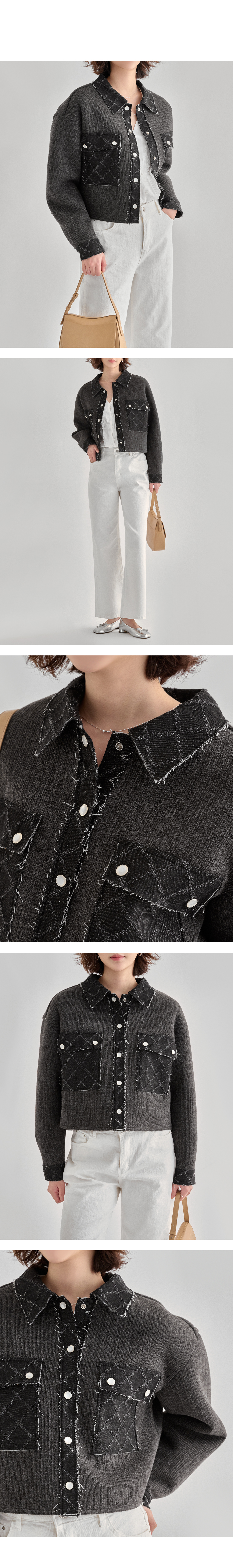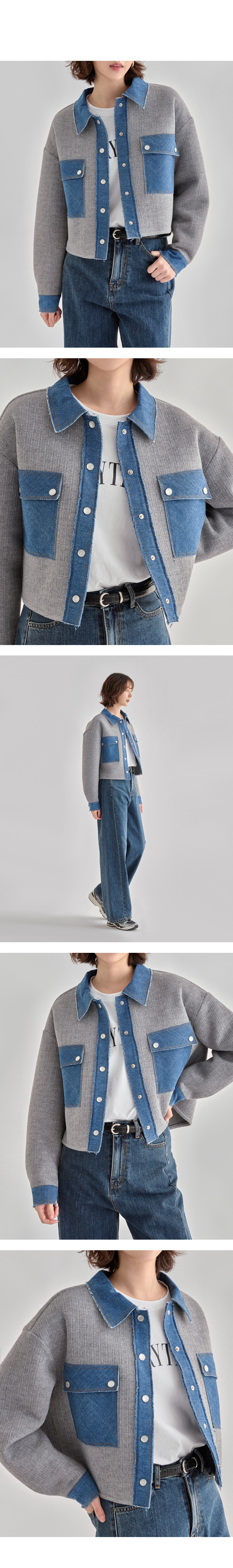 프레이드 디테일이 돋보이는 데님 포인트와 스냅 버튼 여밈이 감각적인 디테일을 더하며, 크롭 기장과 박시한 실루엣이 스타일리시한 핏을 완성합니다.