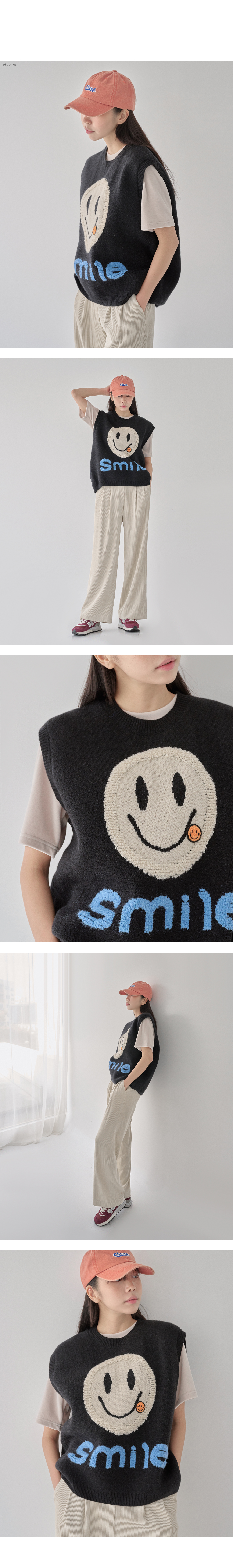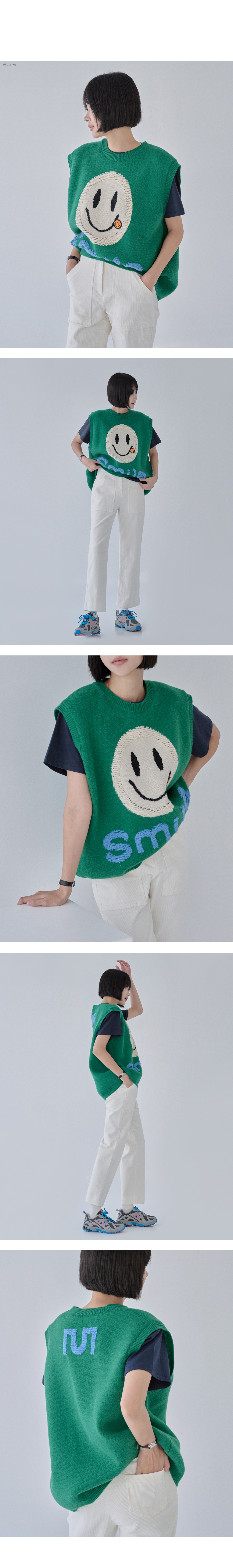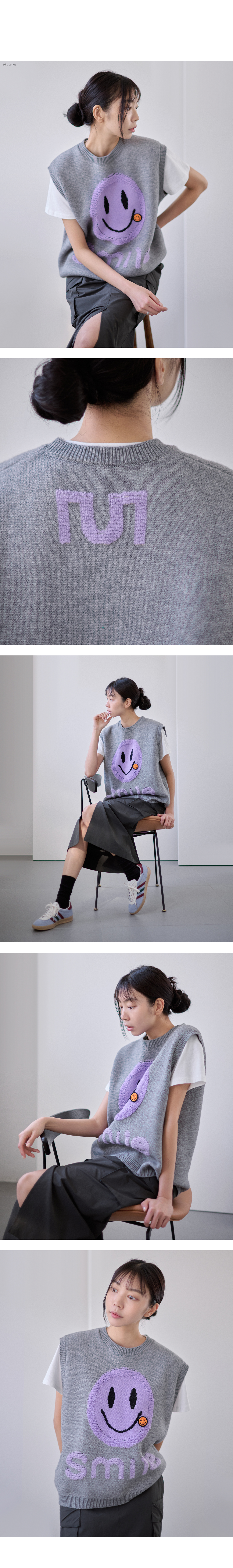 숄더라인과 힙을 덮어주는 오버핏 스마일 니트 베스트.