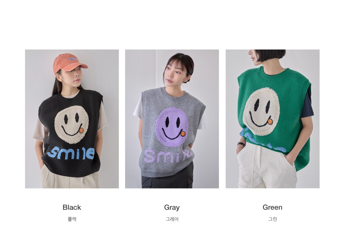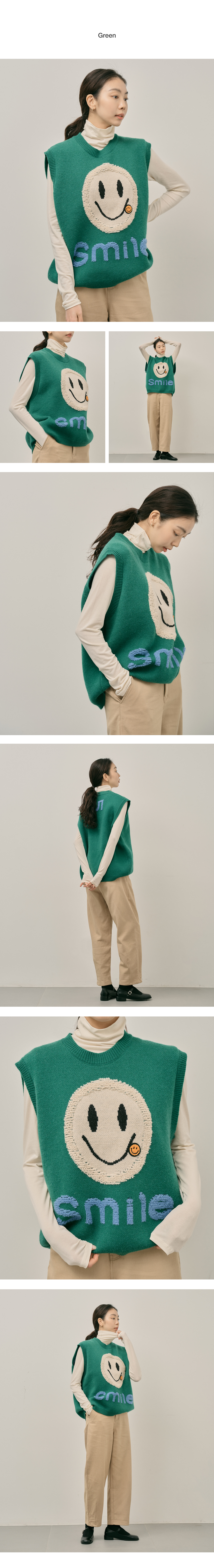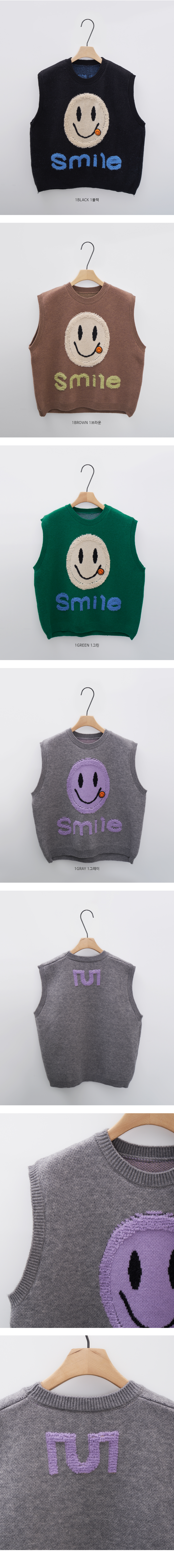숄더라인과 힙을 덮어주는 오버핏 스마일 니트 베스트.