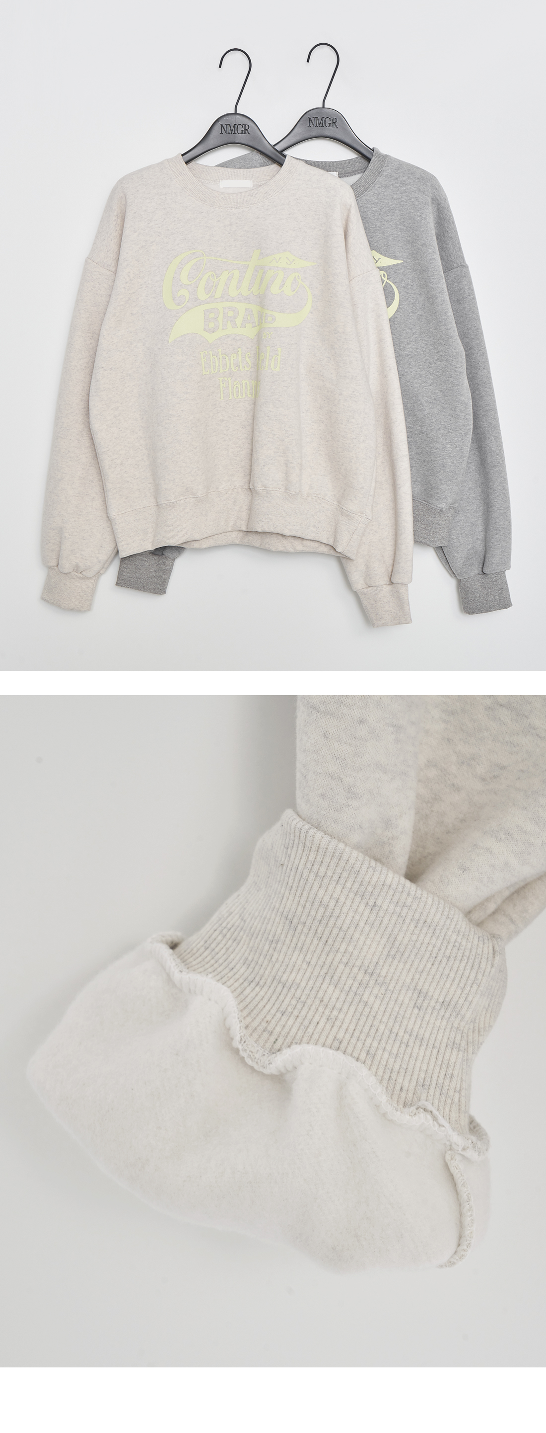 영문 프린팅이 감각적인 무드를 선사하며, 밑단과 소매, 네크라인의 시보리 마감 처리로 늘어짐 없이 착용할 수 있습니다