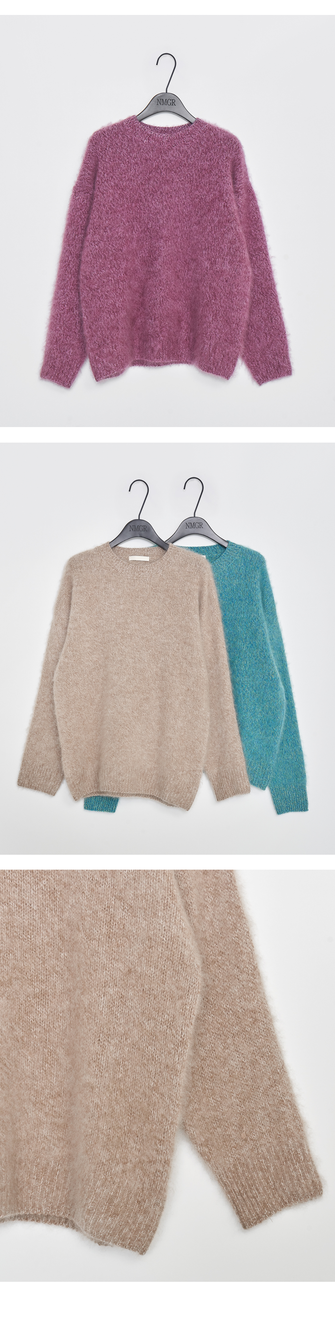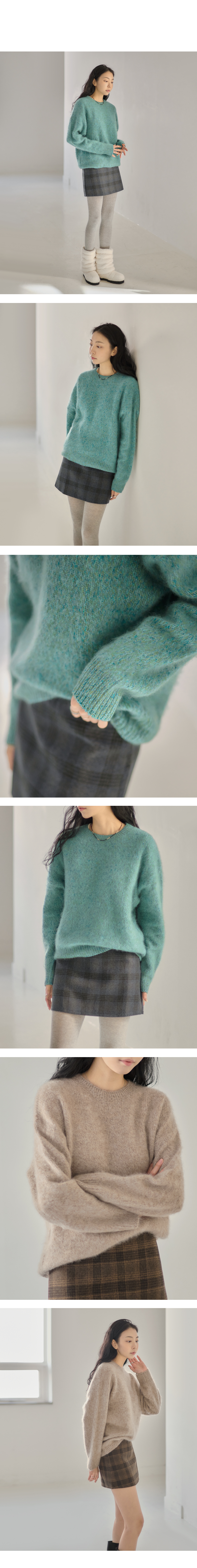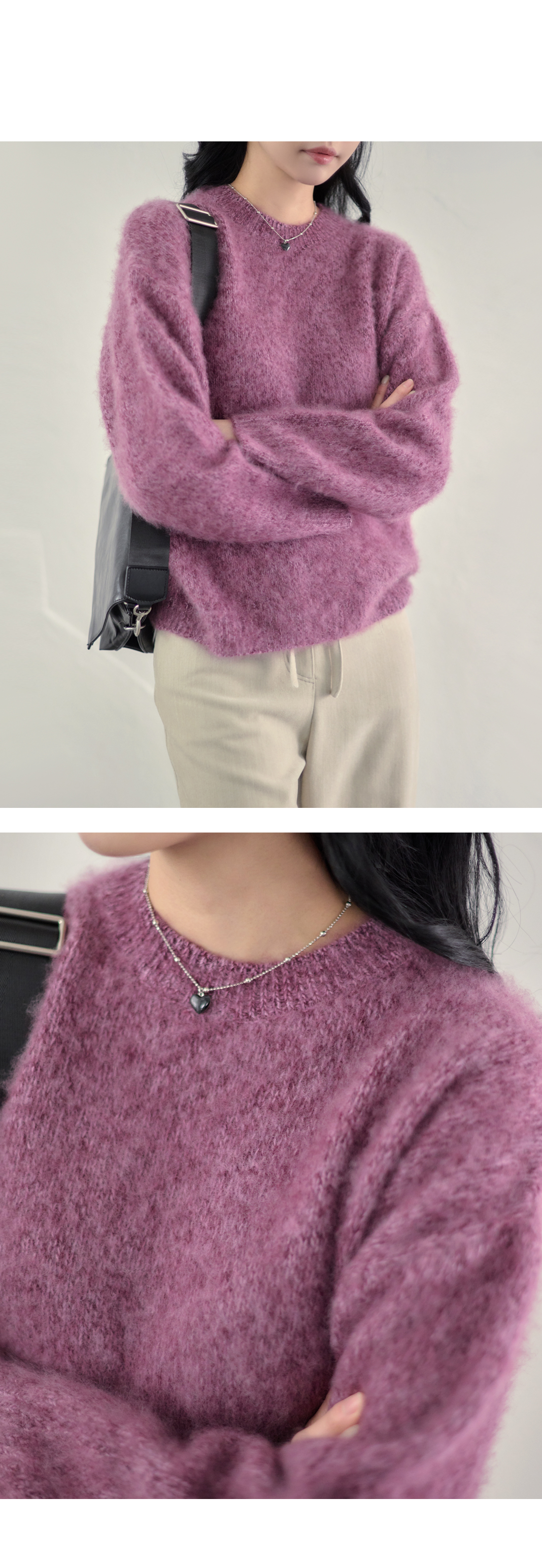 루즈한 실루엣에 헤어리한 텍스쳐가 돋보이는 라운드넥 니트.