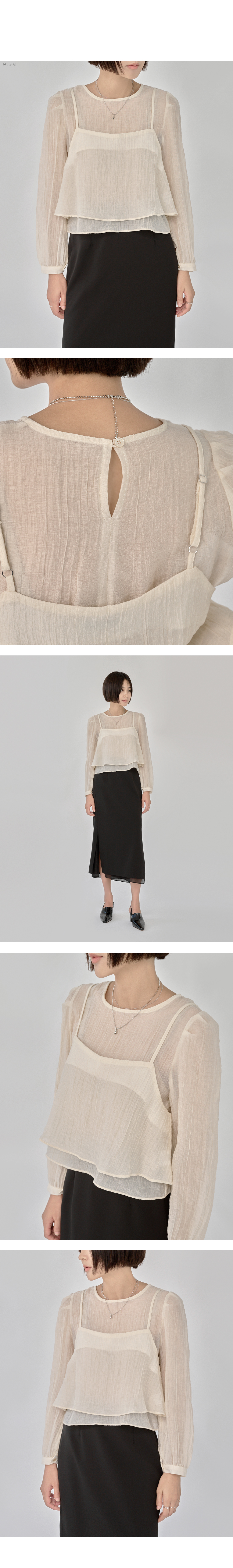 스탠다드 핏에 은근한 숄더 셔링의 블라우스와 어깨 끈 조절이 가능한 뷔스티에 세트로 다양하게 스타일링 할 수 있습니다.