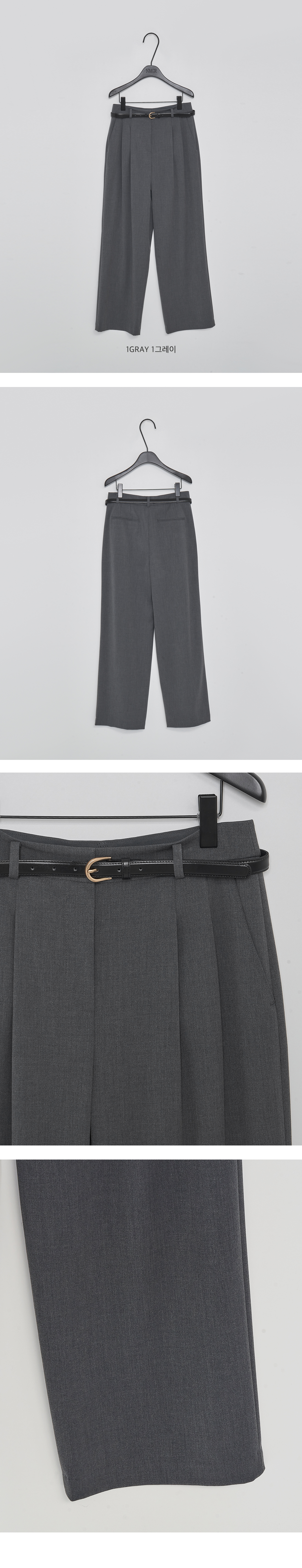 프론트 투-핀턱을 잡아 입체감을 연출해주었고 레더 소재의 벨트를 함께 구성하여 포인트 액세서리로 매치했습니다.