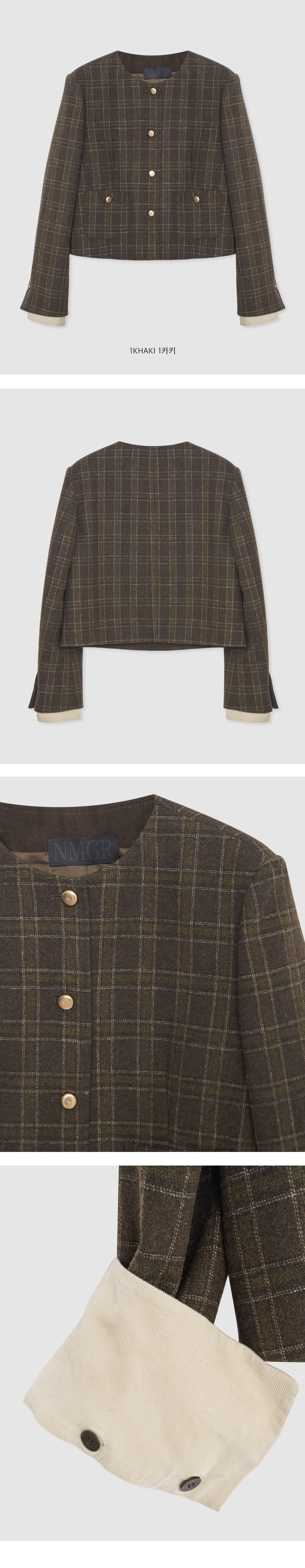 라운드넥 디자인과 골드 버튼 장식이 조화롭게 어우러진 더나무그림 체크 자켓.