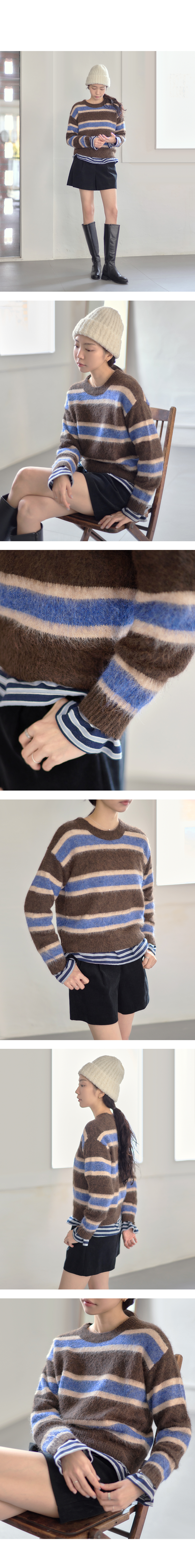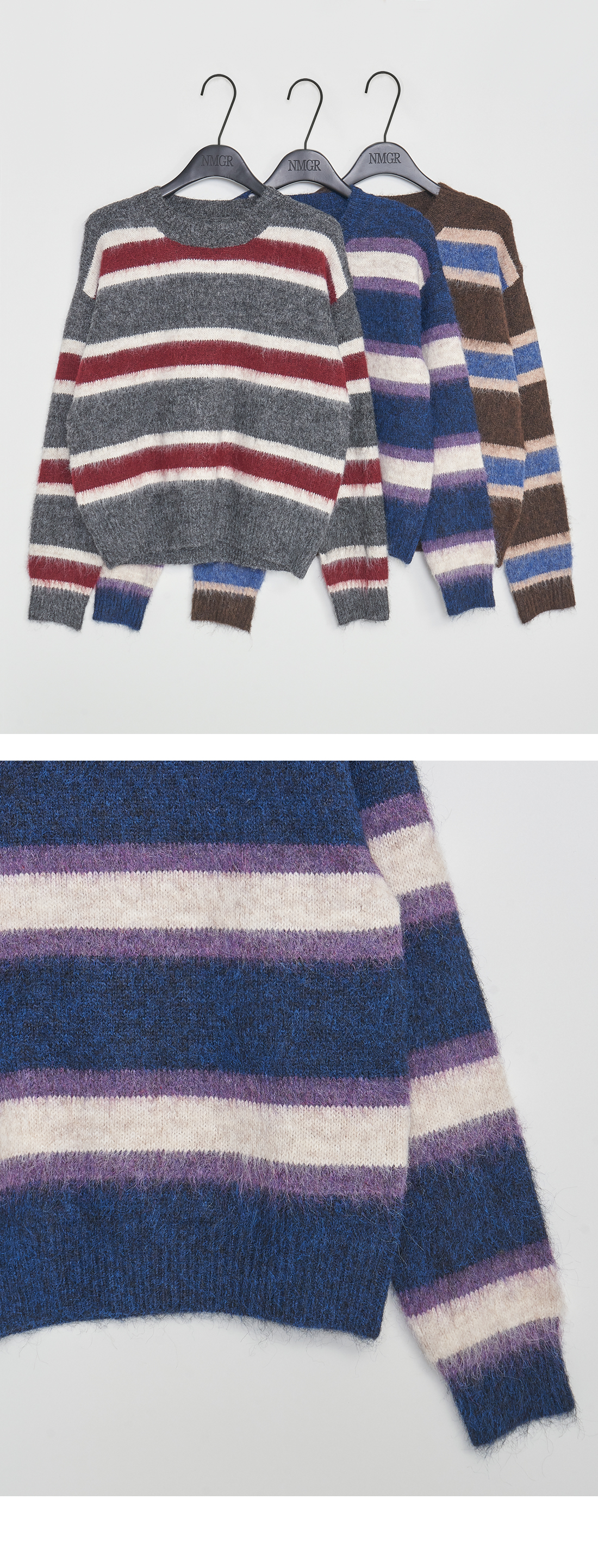 포근한 헤어감이 살아 있는 스트라이프 니트.