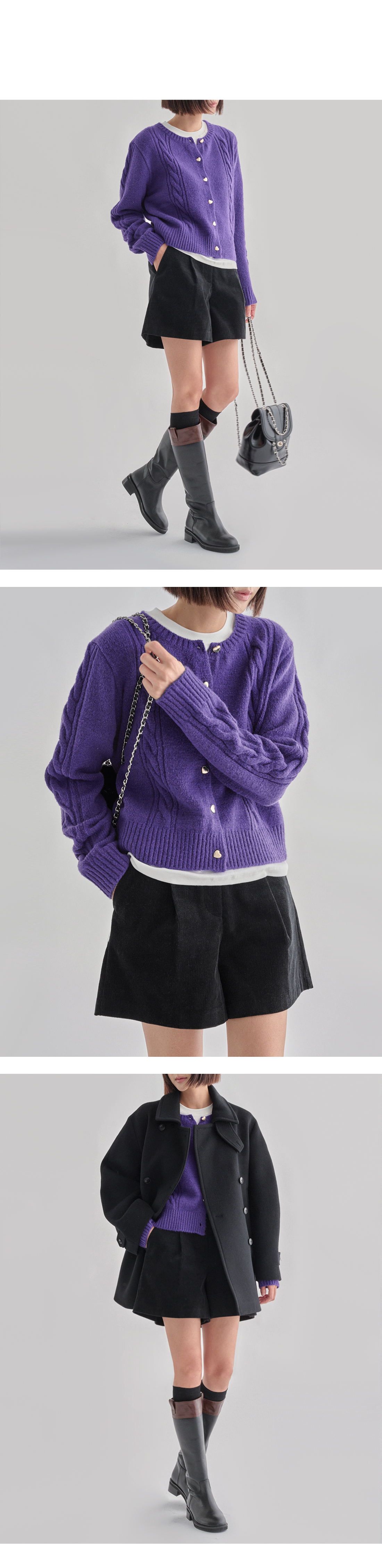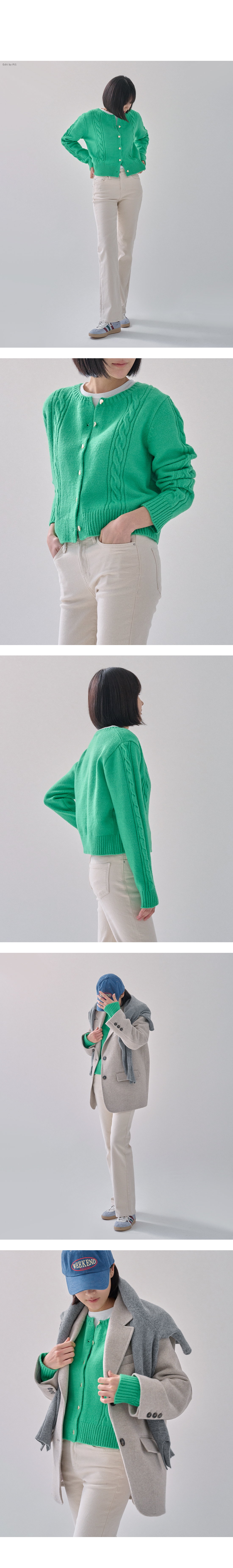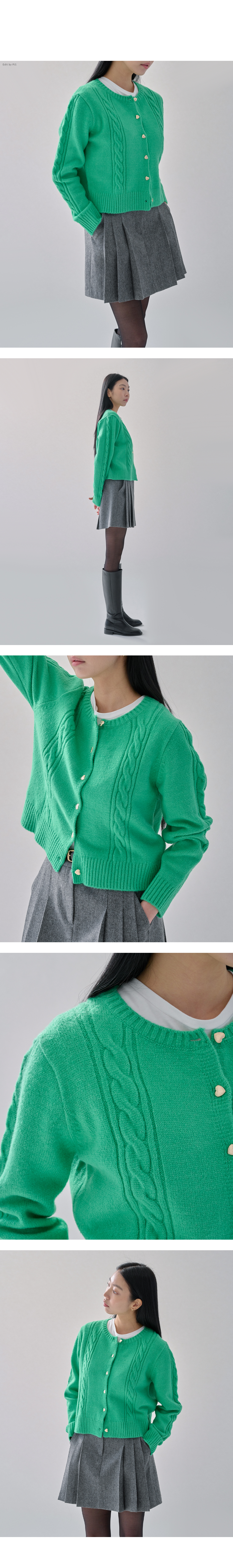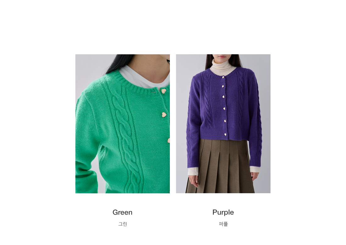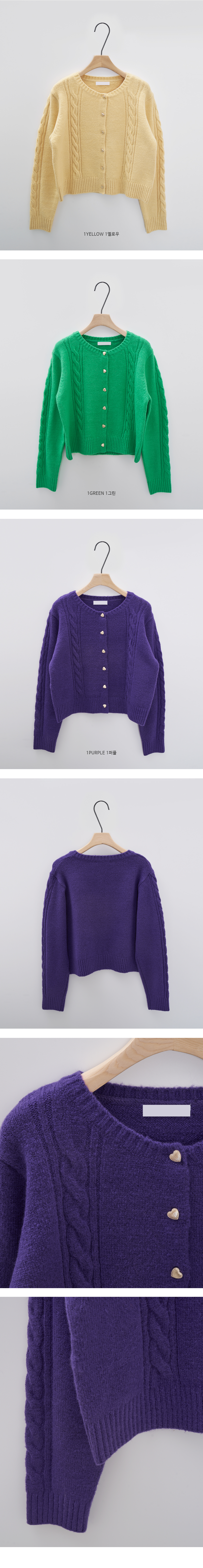 하트 버튼 클로징으로 러블리함이 돋보이며 굵직한 꽈배기 짜임으로 포인트를 주었습니다.
