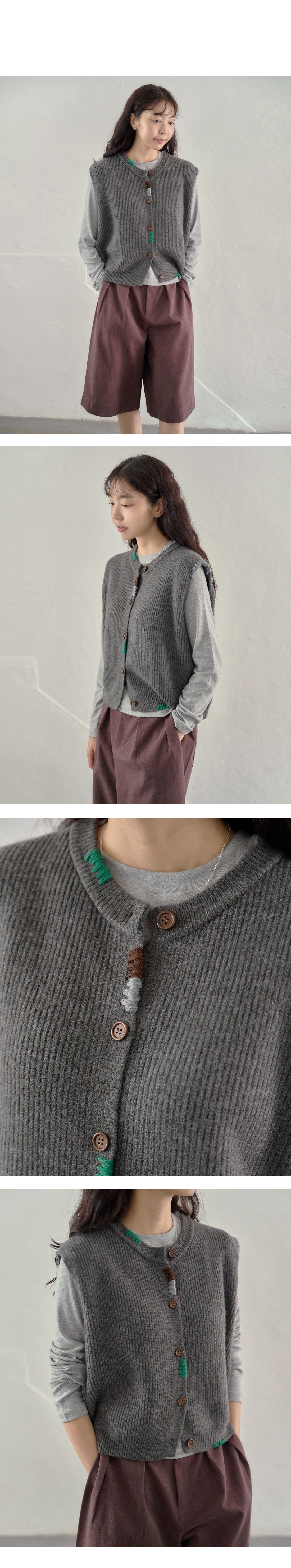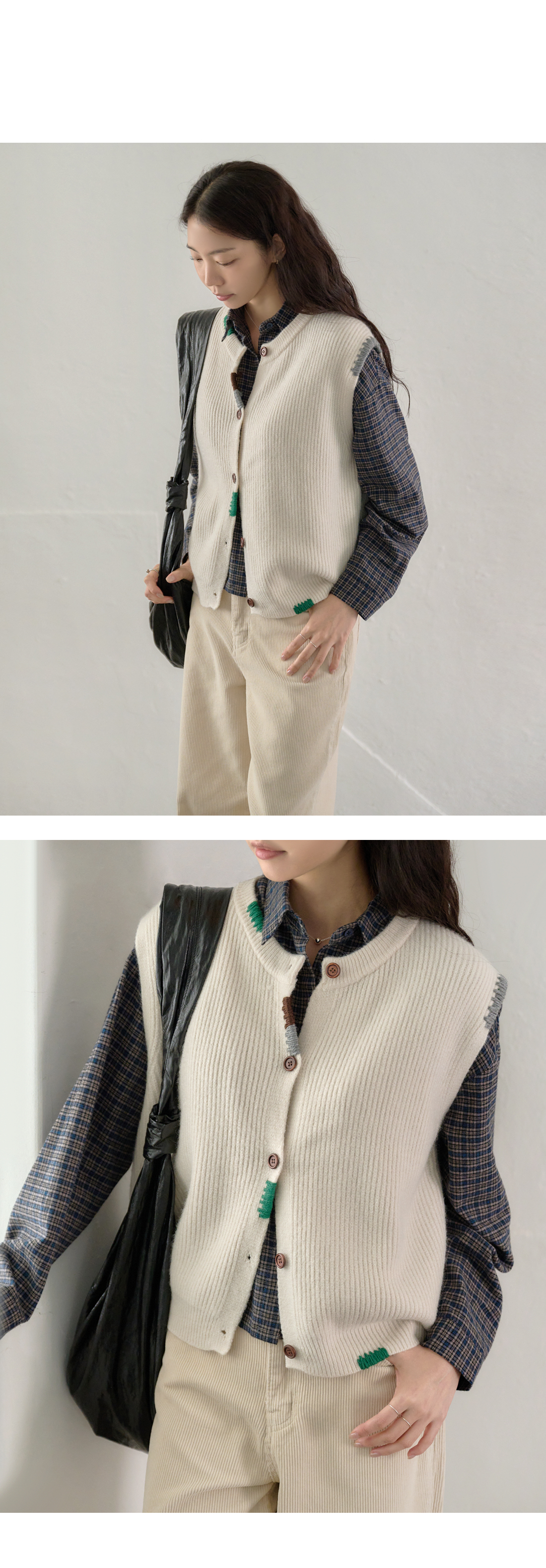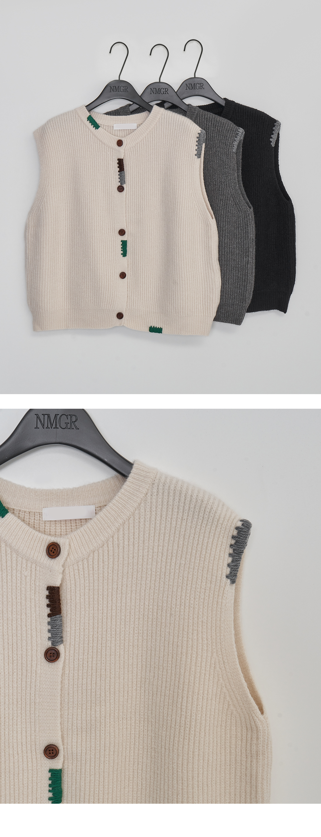 단정한 라운드넥에 자수 디테일이 더해진 니트 베스트.