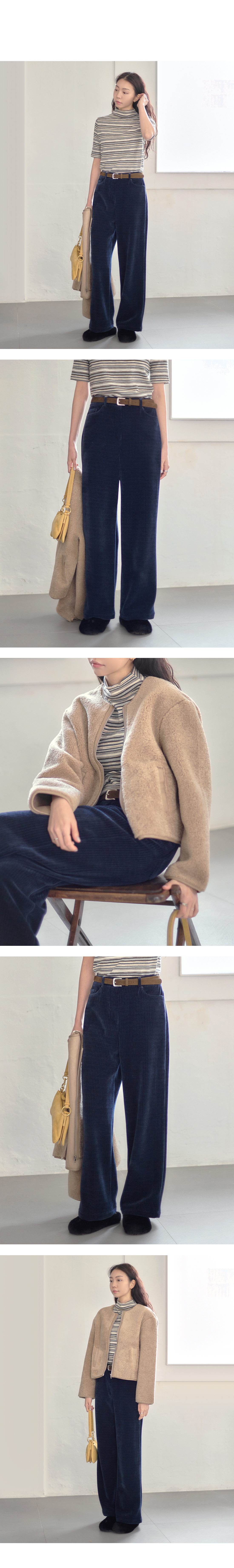 코듀로이 특유의 은은한 광택감과 깊이감 있는 텍스쳐가 세련된 무드를 연출하며, 허리선부터 자연스럽게 떨어지는 와이드 핏이 다리 라인을 길고 슬림해 보이게 합니다.