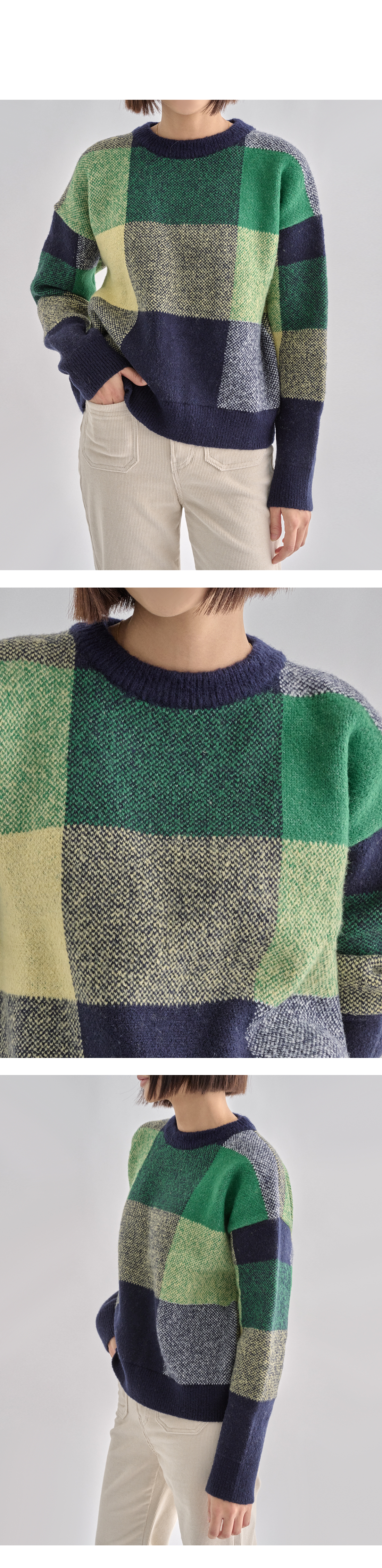 잔잔한 컬러 포인트의 스퀘어 사선 패턴으로 완성된 라운드 니트.