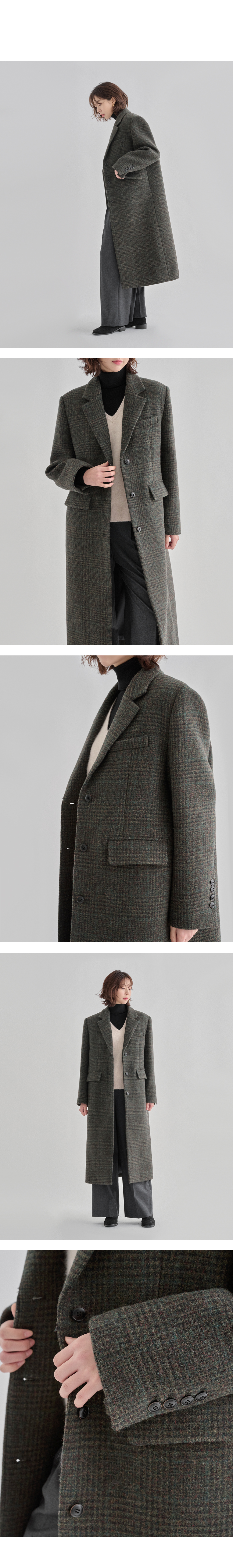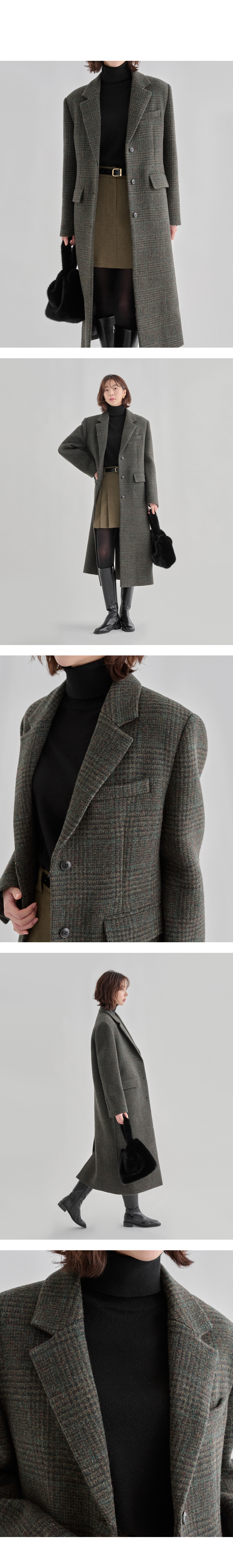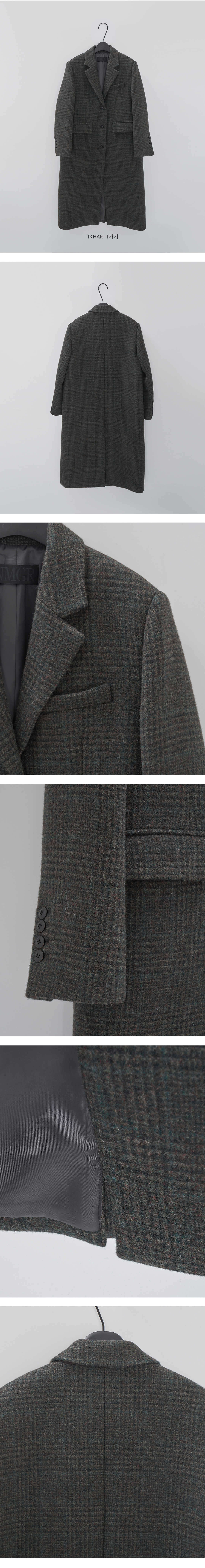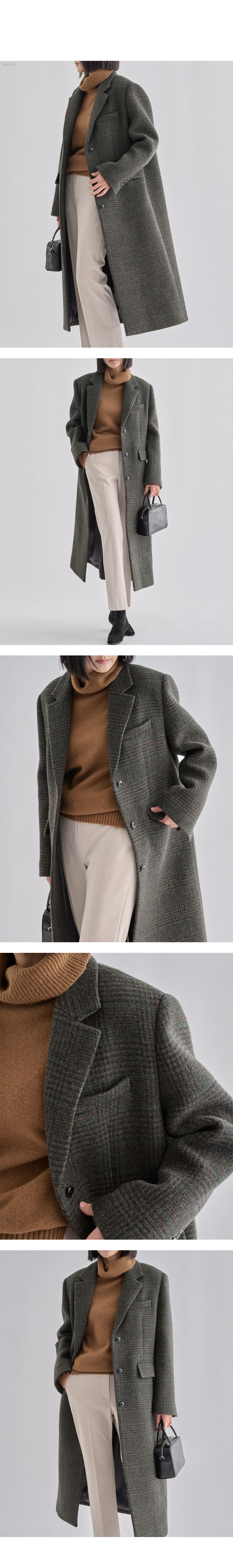 세련된 카키 톤의 글렌 체크 패턴으로 완성된 더나무그림 롱코트.