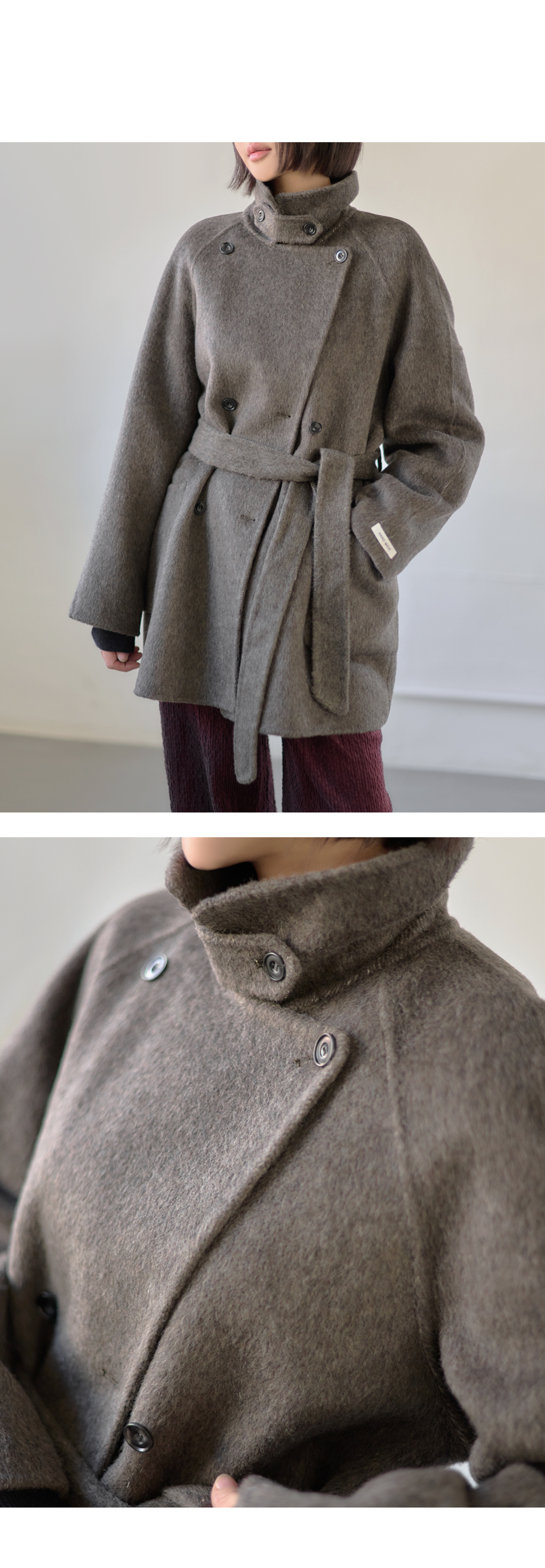 부드럽고 포근한 터치감이 돋보이는 울 혼방 하프 코트.