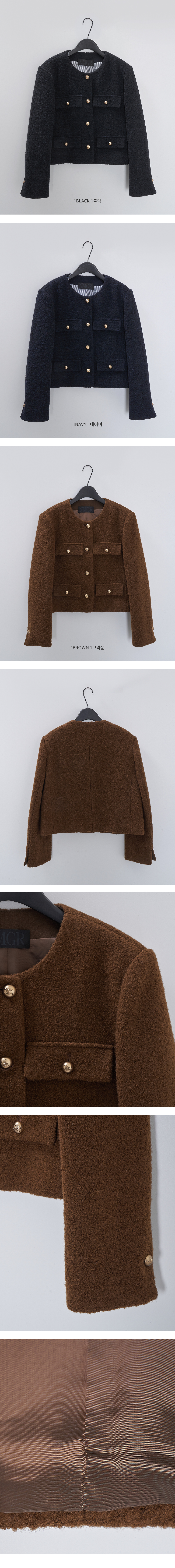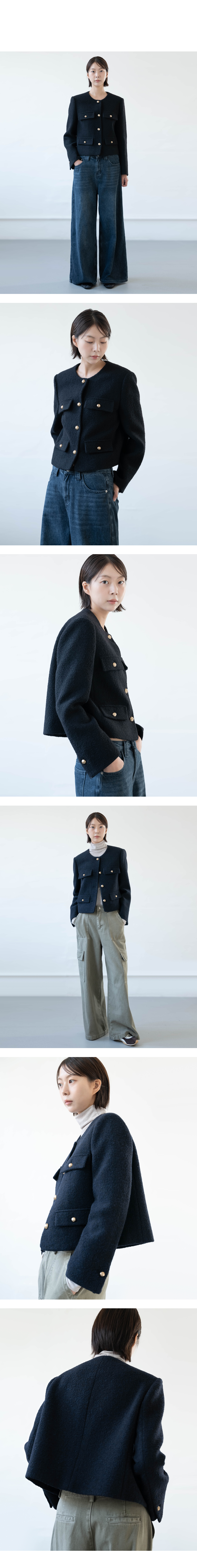 카라가 없는 라운드 네크라인과 금장 버튼 장식으로 간결하면서도 세련된 무드를 선사합니다.