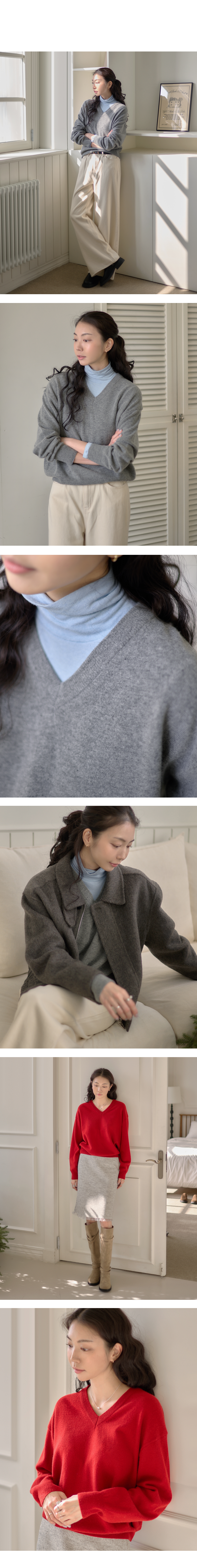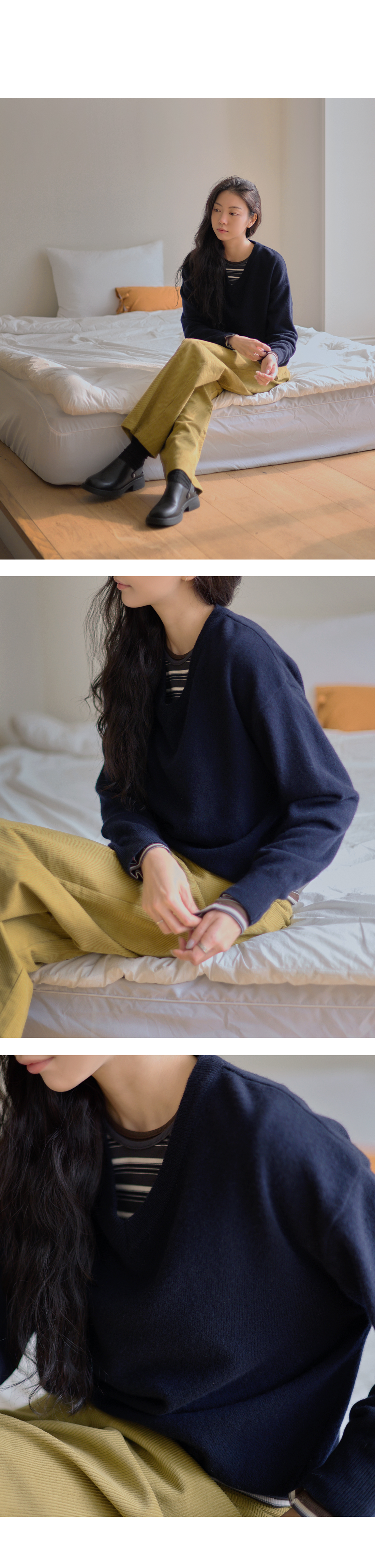 살짝 여유 있는 실루엣과 깊지 않은 브이넥 디자인으로 단정하면서도 편안한 분위기를 연출합니다